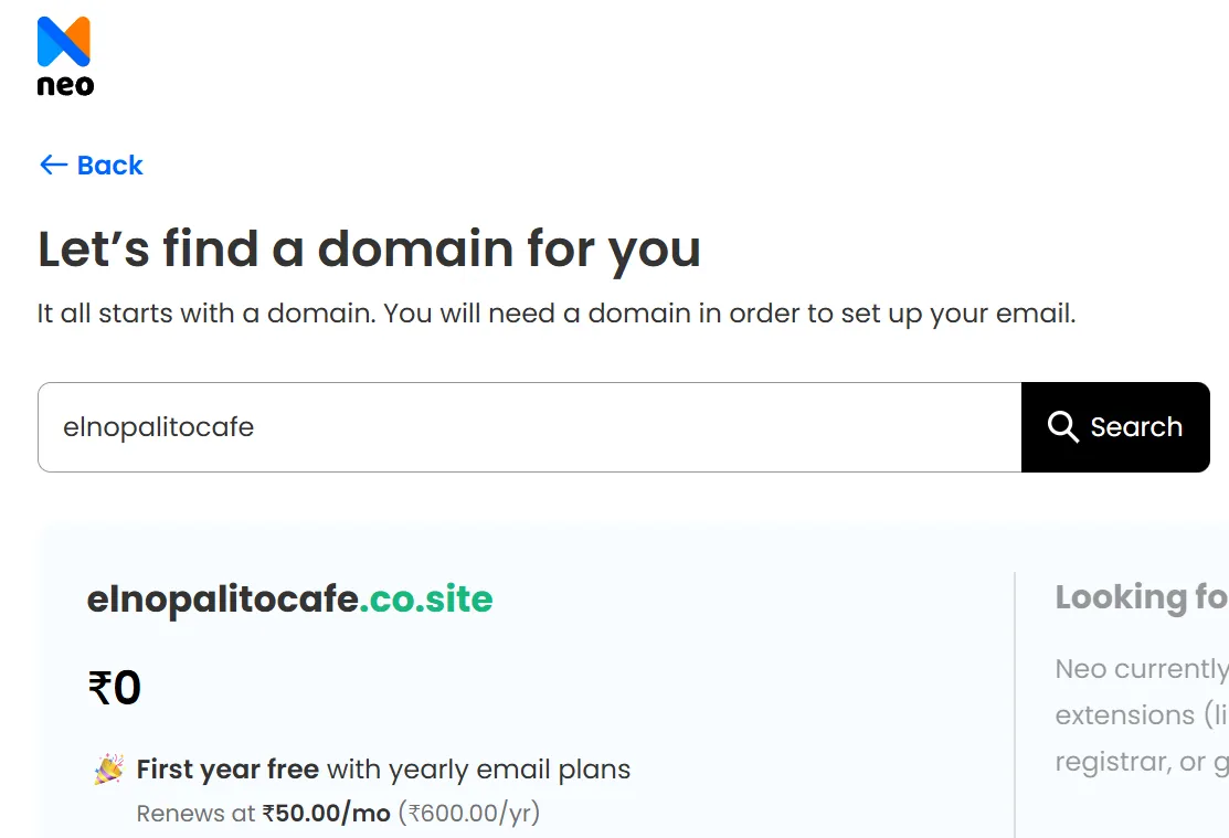 Enter the desired domain name and check whether it is available. Once it is available, Neo will register it with a (.co.site) extension.