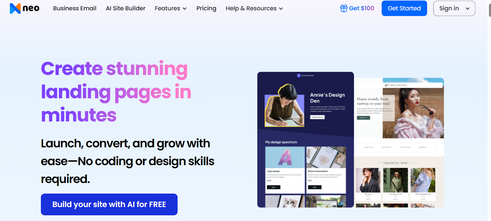 1. Visit Neo Sites. Then click ‘Build your site with AI for free’.