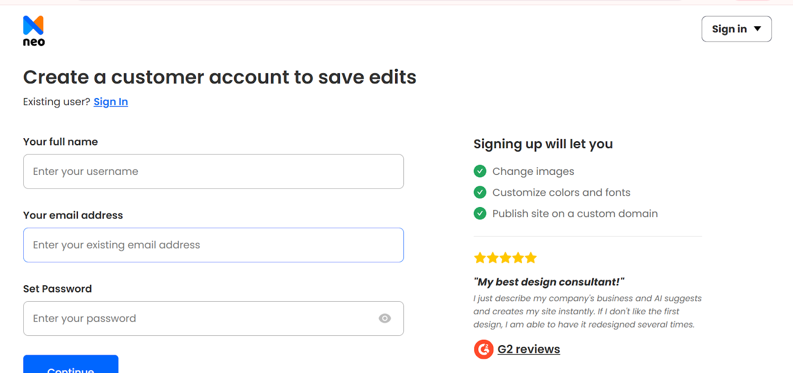 5. Before you edit, Neo Sites will ask you to create a customer account. After entering all the information and creating the customer, you can register a custom domain for free, then customize the website and launch it.
