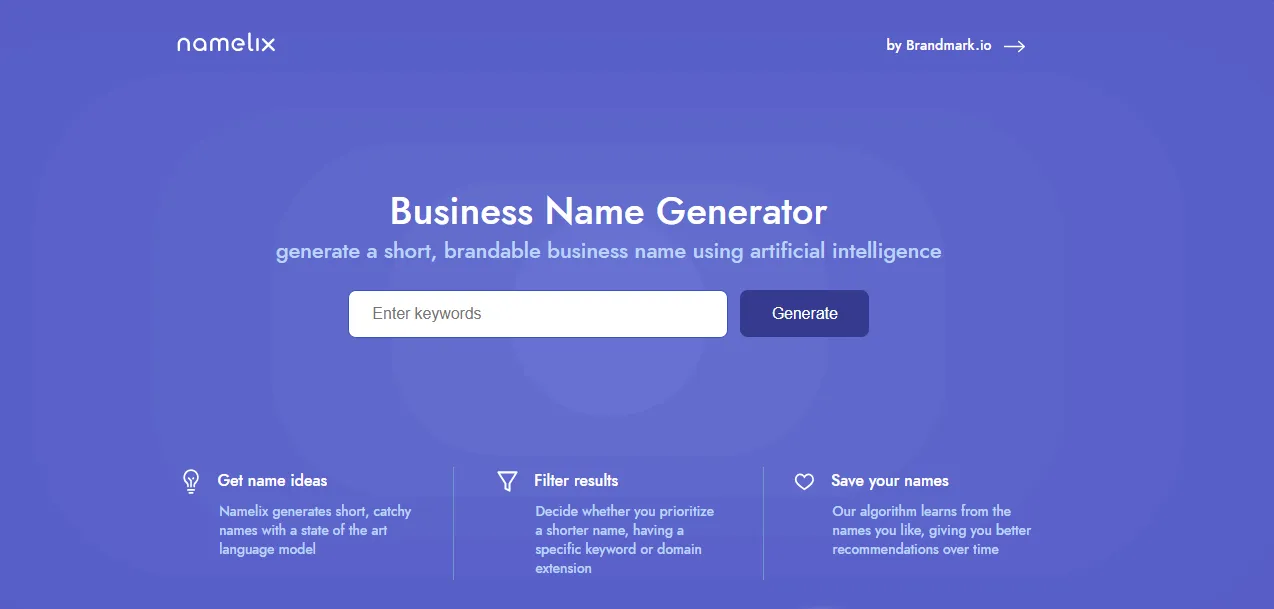 Namelix is an AI-driven business name generator which is not based on merely combining words in a dictionary, but rather, it attempts to create short and brandable names. Users can create a name by giving keywords, and the algorithm learn the preferences through these keywords and provides more appropriate recommendations. The tool also comes up with ideas for the logo that match the names, which helps to create an overall brand.