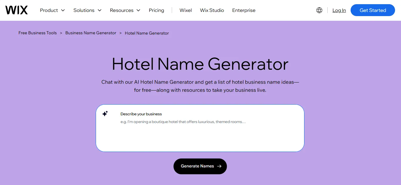 Wix Business Name Generator is an artificial intelligence-based tool that enables users to discover a name that best suits their brand image and experience. The tool helps users by just typing in a word that defines the type of hotel they want, i.e., cozy or luxury, and the tool will come up with a lot of ideas. It allows owners of the hotel to get a catchy name that is easy to remember and pronounce, thus making a great initial impression on their potential customers.