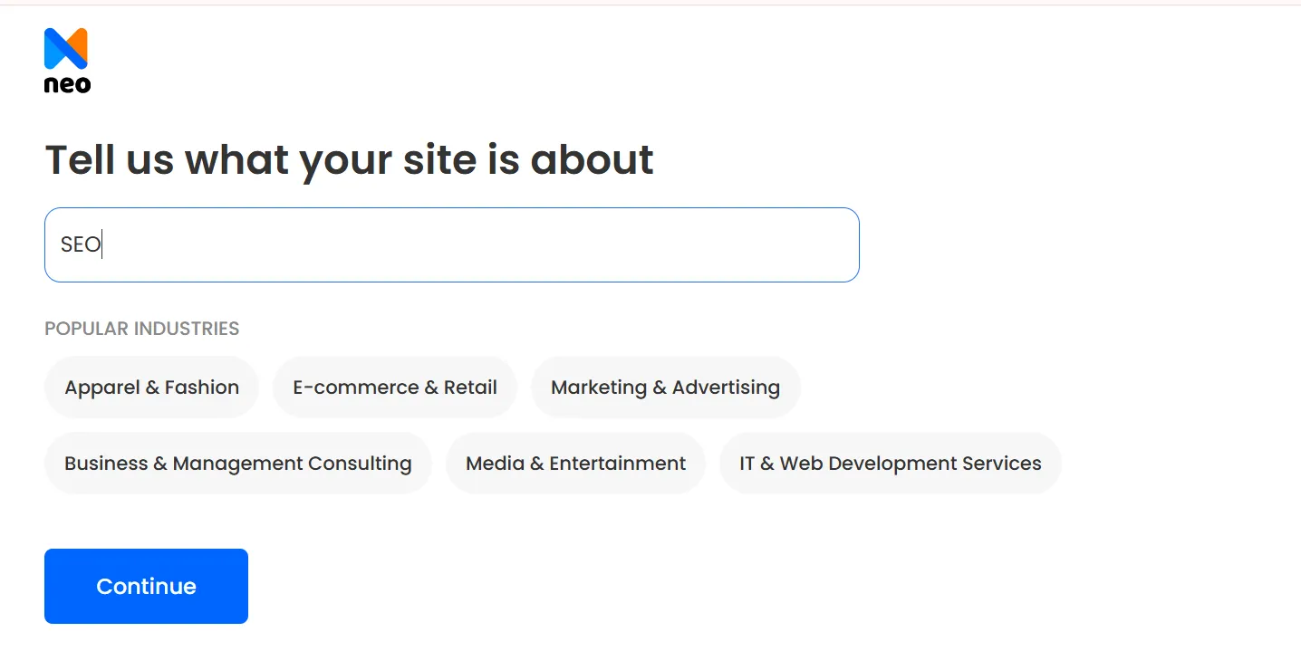 - Select from the drop-down list and select the relevant category. In this case, let’s select ‘SEO’. Then click on ‘Continue’.