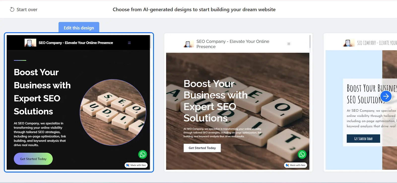 - Neo Sites will create multiple website options for your SEO business. Select the one you like, and click on ‘Edit this design’.