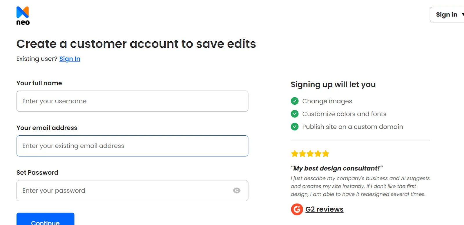 - Before editing, you will be asked to create a customer account. Enter all the necessary requirements, and click on ‘Continue’. Once this is done, you will be able to register your domain name for free, and then, you can edit the website in terms of fonts, colors, layout, themes, etc.