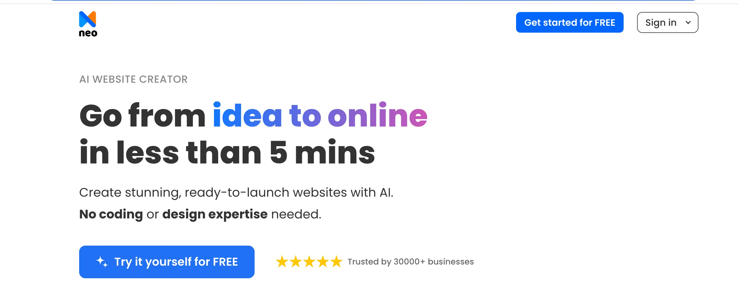 Neo offers the most cost-effective website builder on the market, designed to give growing businesses a stunning online presence without breaking the bank. With Neo, you can create a professional, AI-powered website effortlessly while saving both time and money. Unlike expensive alternatives, Neo provides unbeatable value with affordable pricing plans that include a free domain for one year, hosting, and easy customization tools. Perfect for entrepreneurs, small businesses, and creators, Neo empowers you to build a high-quality website at a fraction of the cost. Start today and get online smarter, faster, and for less with Neo’s website creator!