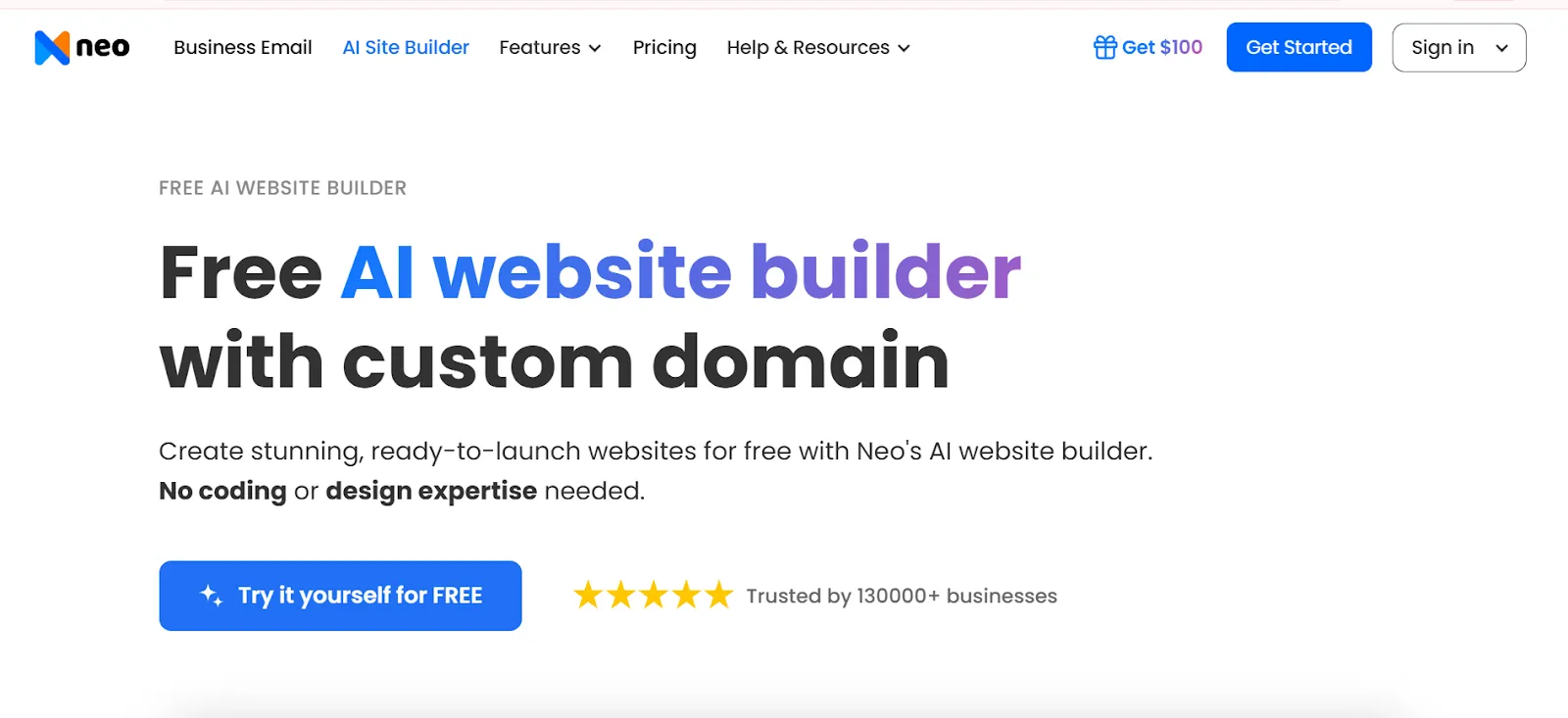 - Open the Neo Sites’ website, click on ‘AI Site Builder’ and then choose ‘Try it yourself for free’.