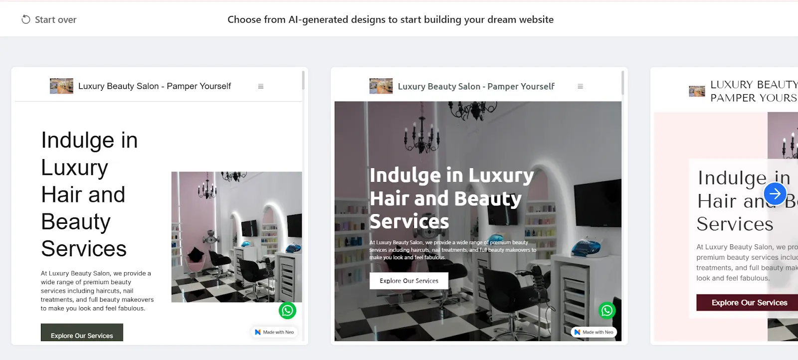 - Next, click on ‘Generate Site’. Then, using AI, Neo Sites will create different website templates according to the description you provided.