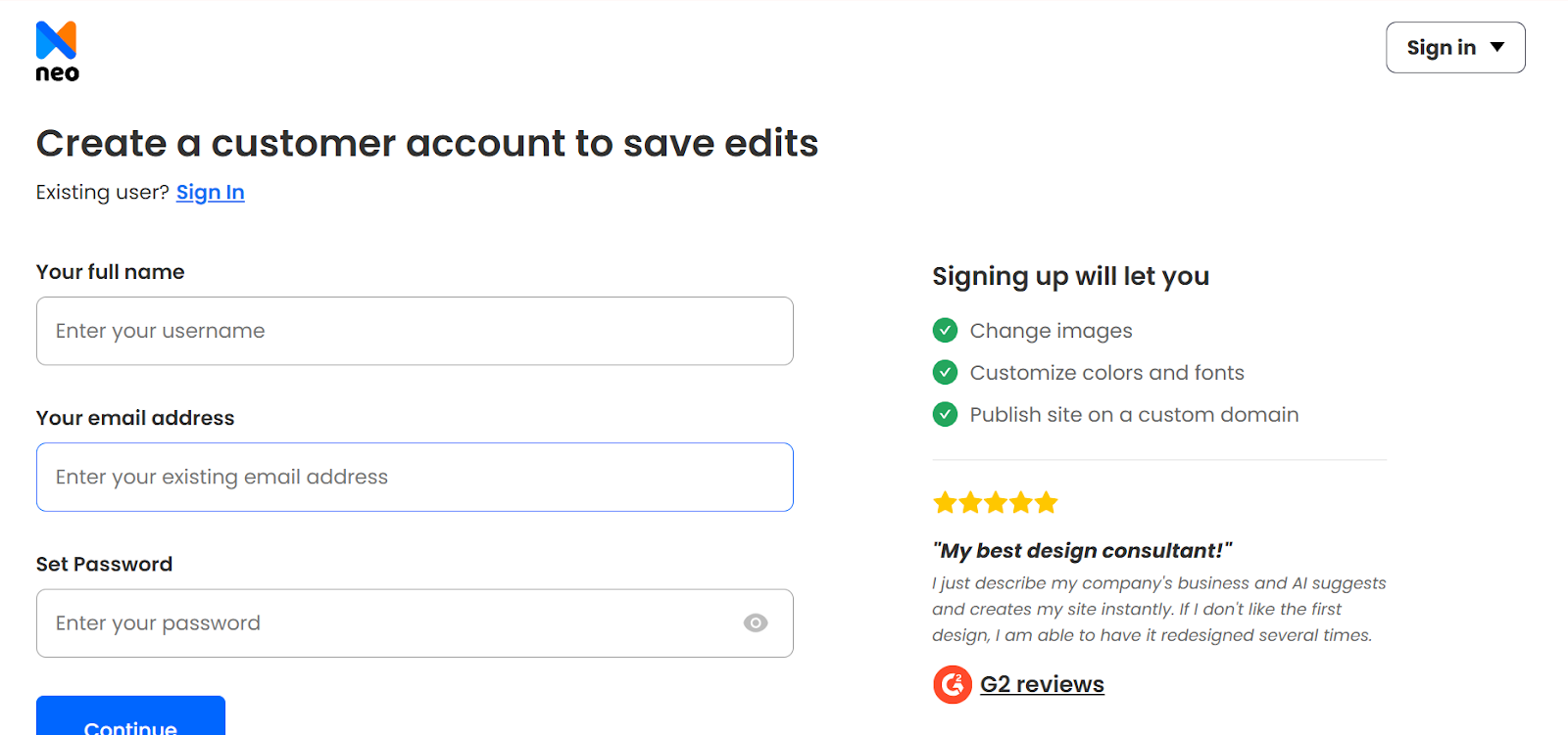 Step 5. Create your Neo account, register your custom business domain, and launch your static website.