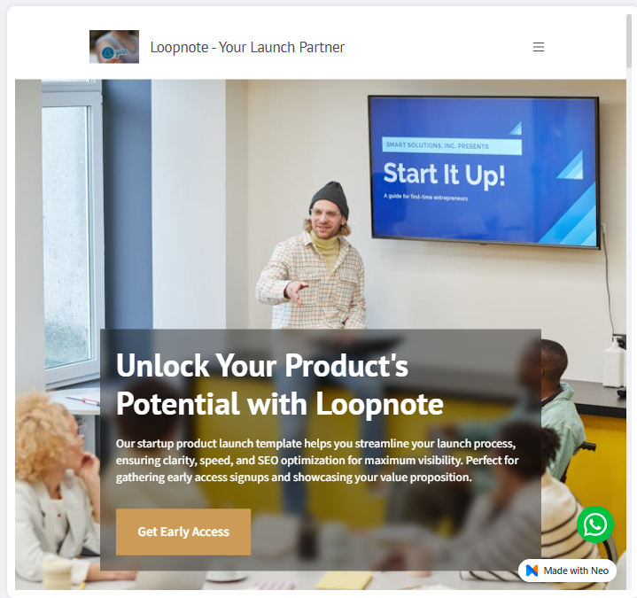 The example template of a startup product launch static website presents a modern, conversion-focused design. Featuring a bold hero message, real-world images, and meaning call-to-action highlights its credibility and enhances the value proposition.
