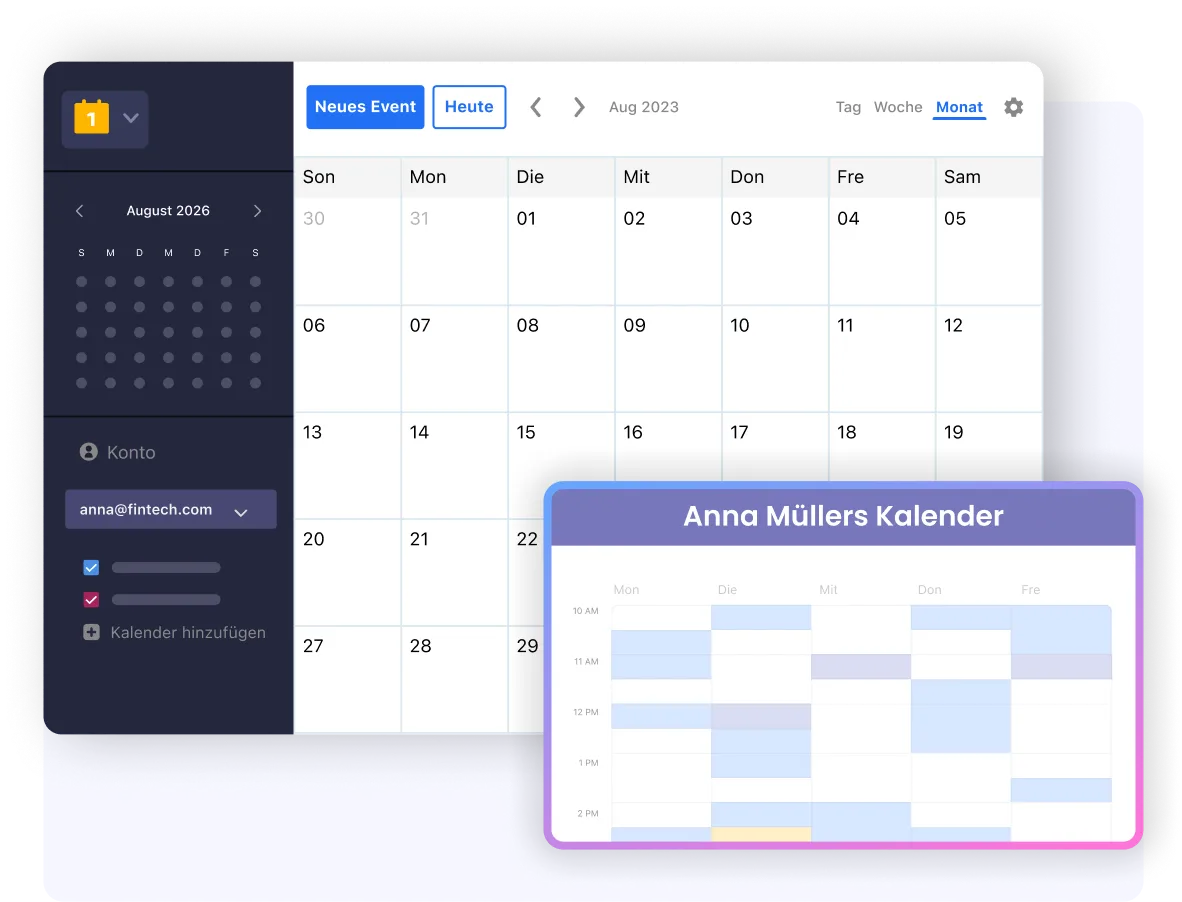 Teilen Sie Ihren Kalender mit Kontakten, planen Sie Termine und integrieren Sie Ereignisse aus anderen Kalender-Apps.