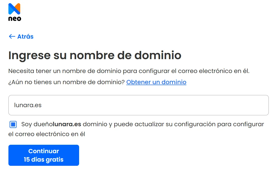 Proporcione el nombre de dominio que posee mediante un registrador de dominios de terceros, haga clic en la casilla de verificación y, a continuación, pulse Continuar. Neo verificará rápidamente la propiedad del dominio.
