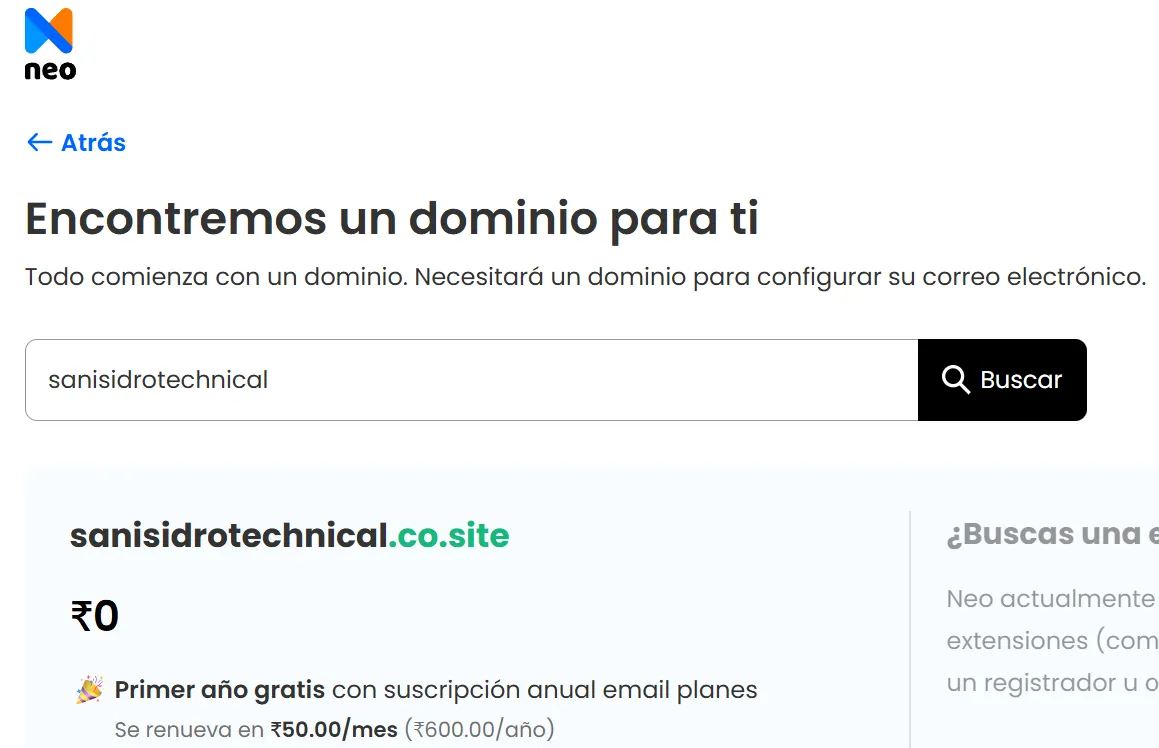 Para las empresas sin dominio, Neo ofrece un dominio.site gratuito como parte de su servicio, lo que permite la configuración y el uso inmediatos de un identificador de correo electrónico profesional.