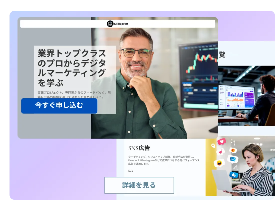 コードも複雑さも不要です。コースの説明を入力するだけで、無料の独自ドメイン付きサイトが完成します。コーディングレッスンではなく、教えることに集中できます!