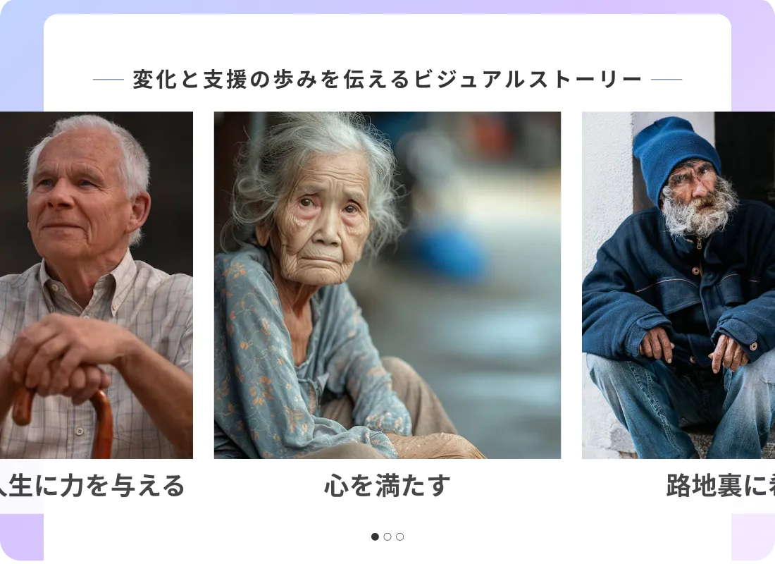 高品質な画像はあなたの活動の核心を捉え、訪問者の心に訴えます。素晴らしい写真が変化している人々の生活を映し出し、行動を促します。