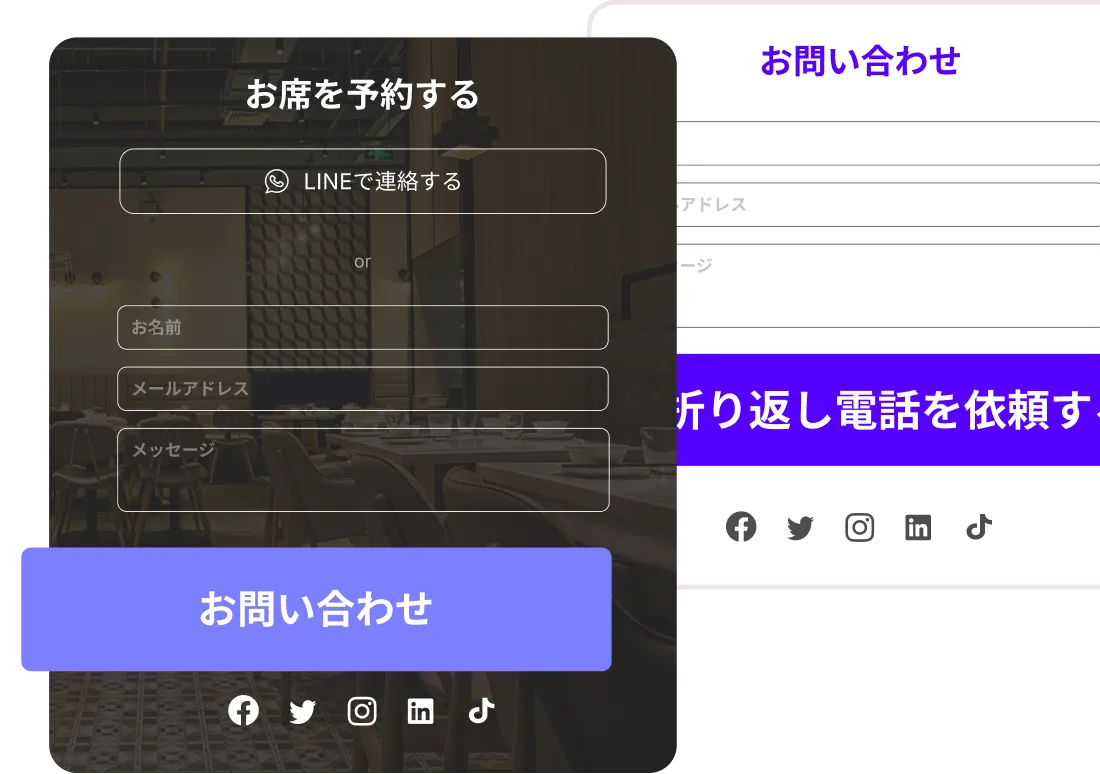 予約、問い合わせ、プライベートイベント用の明確なフォームを追加しましょう。場所、電話番号、SNSリンクなどの必須情報を含め、顧客が質問やフィードバックを簡単に送れるようにします。