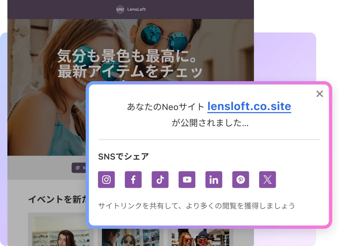 Neo Sitesなら、専門的な知識がなくても、無料ドメイン付きのプロフェッショナルなサイトをすぐに公開できます。