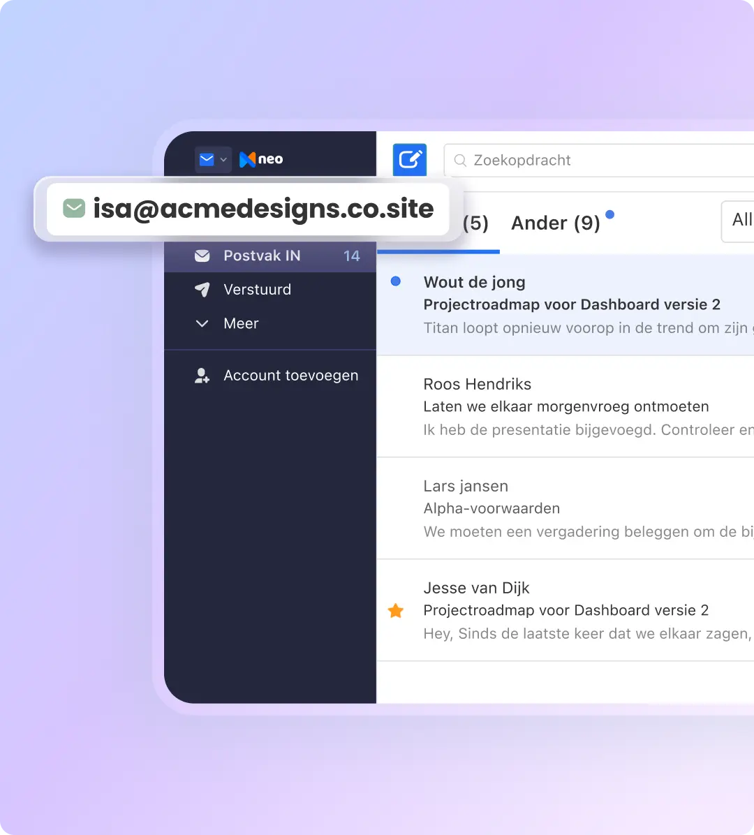 Neo is een suite voor bedrijfsgroei die uw bedrijf helpt online te groeien met diensten zoals een website, een domeinnaam en een zakelijk e-mailadres. De zakelijke e-mailservice bevat een aangepast e-mailadres en krachtige functies waarmee kleine bedrijven hun merk kunnen versterken.